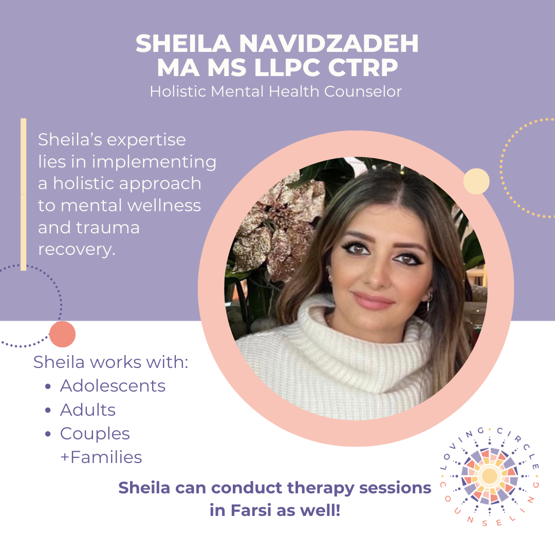 Sheila is a licensed therapist and mental health advocate based in Michigan, providing virtual sessions. Sheila is committed to helping individuals achieve emotional and psychological well-being. As a therapist, Sheila understands the importance of emotional and psychological well-being and how it impacts an individual's quality of life. Experiencing emotional or psychological distress can affect every aspect of their life, including their relationships, work, and daily activities. Sheila has always had a passion for personal growth and self-care. This passion has led to diverse interests, including yoga, sound healing meditations, scuba diving, and flying single-engine aircraft. With a love for adventure, she has traveled to 48 countries, including some of her favorite destinations, such as Turkey, Bali, and Spain. As a first-generation Persian-American, she provides services in Farsi as well. In addition to her love for adventure, she is also committed to living a healthy lifestyle. As a pescatarian, she recognizes the importance of maintaining a balanced diet to support optimal physical and mental health. Sheila's passion for mental health extends beyond her interests and into her professional practice. As a therapist, she utilizes a variety of therapeutic approaches, including person-centered, Cognitive Behavioral Therapy (CBT), Humanistic, Mindfulness-Based Cognitive Therapy (MBCT), and Holistic therapy. Sheila has also completed the Trauma and Resilience Specialist training. Focusing on personalized treatment plans, she creates a safe and supportive environment for her clients to explore their emotions and thoughts. Sheila's advocacy work centers around supporting vulnerable populations, including the unsheltered and LGBTQ+ youth. She is also a proponent of mindfulness practices, such as sound baths, sensory exercises, intentional breathing, meditation, visualization, yoga, and journaling. Through these practices, she aims to help her clients develop self-awareness, self-compassion, and a greater connection to themselves and others. When she's not in the office, Sheila enjoys spending time with her family and friends, exploring new restaurants, attending live music events, and embarking on trips to national parks and other new cities worldwide. Her love for adventure, passion for mental health advocacy, and commitment to personal growth make her a valued member of the therapy community.